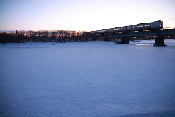 凍っている川を渡り、寒い中札幌を目指す特急「おおぞら」。