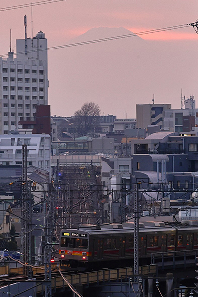 夕空にほのかに見える富士をバックに、大井町線9000系が通り過ぎます。