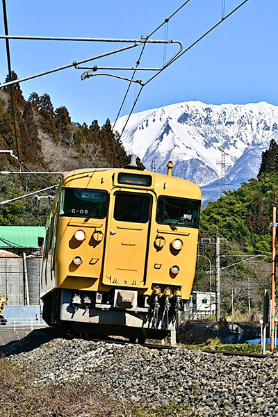 雪を頂いた霊峰大山をバックに115系は最後の力を振り絞って走ります