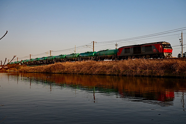 日暮れ間際に輝く貨物列車が川面に映る姿を撮影出来ました。