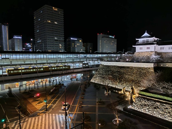 ライトアップされた駅前の福山城を横目に、停車中の福塩線105系2連