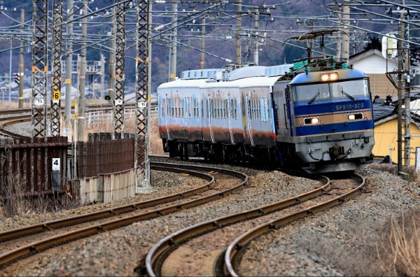 S字カーブを軽快に駆け抜けて来たのは機関車に牽引された観光列車