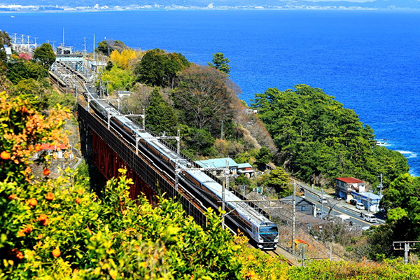 みかん畑から相模湾を見下ろす農道を上がり、かつての有名撮影地の白糸川橋梁を眼下に、青き海原を望みます。列車は下り特急「踊り子」E257系。