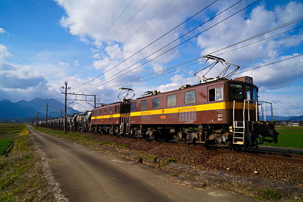 藤原岳と富田駅に向かう駅に向かう、ED45牽引のセメント貨物。