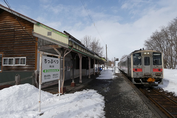 晴れ間が出たお昼過ぎ、いつもの時間に列車が到着。雪解けとともに列車も駅も見納めとなります。