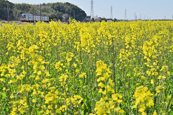 大きく広がる菜の花畑は、いかにも渥美線沿線らしい風景です。