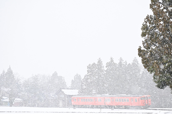 沢山降る名残り雪の中、季節の移ろいを楽しむ様に、赤い気動車が往きました。