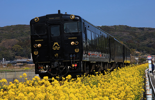 線路沿いにどこまでも続く菜の花の横を「かんぱち・いちろく」が駆け抜けていきます。