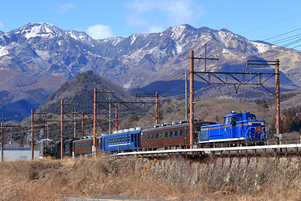 雄大な女峰山をバックに東武日光駅を出発する「SL大樹ふたら」。東武日光から下今市まではDE10の牽引になります。