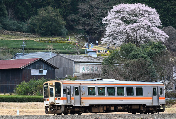 名松線沿線の名所、「竹原の淡墨桜」。曇り空の下、多くの人が思い思いに桜を愛でていました。