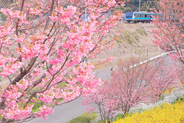 濃いピンク色が目立つ陽光桜が今年も咲き始めました。E233系1000番代ブルースカイの帯がよく映えます。