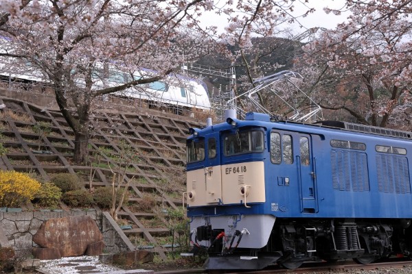 静かにたたずむ山男EF64。桜とともに「あずさ」号を見送っていました。