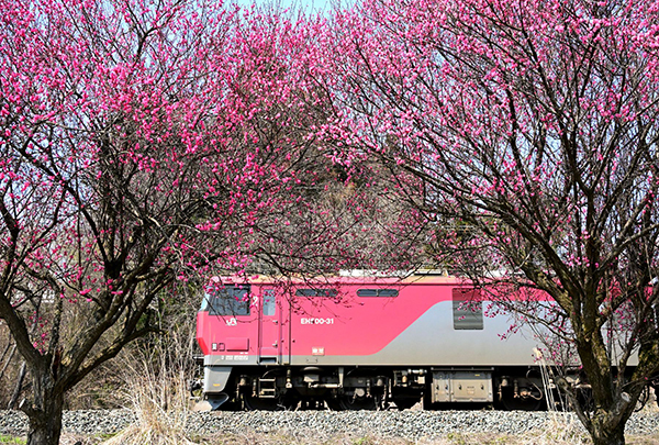 石鳥谷駅の近くに咲く、花桃と「金太郎」がコラボしました。