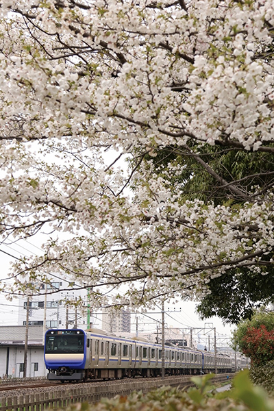 沿線の桜が咲き誇る頃、E235系1000番代が通り過ぎて行きました。