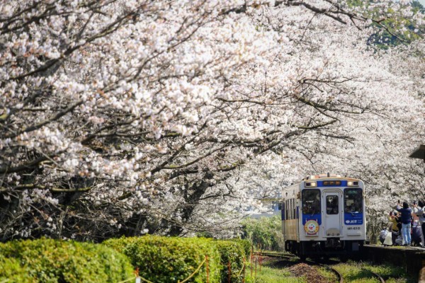 浦ノ崎の桜は今年も満開を迎え、駅ホームが賑わっていました。