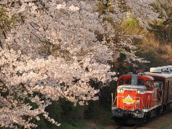 国鉄色のDE10が牽引するトロッコ列車は満員御礼、終着駅を間近にして満開になった間坂の桜を眺められた乗客は列車旅を満喫したことでしょう。