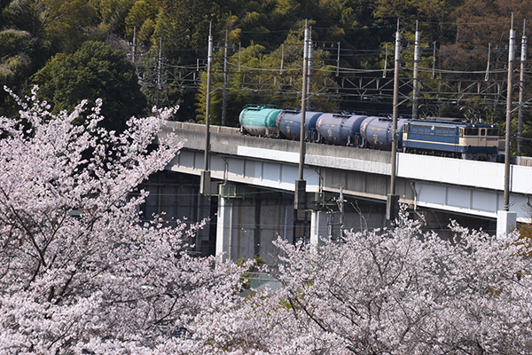 満開の桜と短い貨車を牽いて来た機関車を1枚の絵にしてみました。