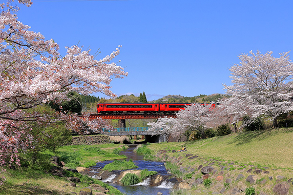 お花見日和、「九州横断特急」が桜の合間を駆け抜けます。