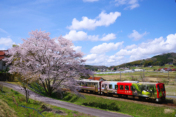 4月から再スタートした「庄原ライナー」の備後落合までの延長運転で、普段1両しか走らない区間を2両の列車が走り抜けていく様子を桜と青空の下で撮影してみました。
