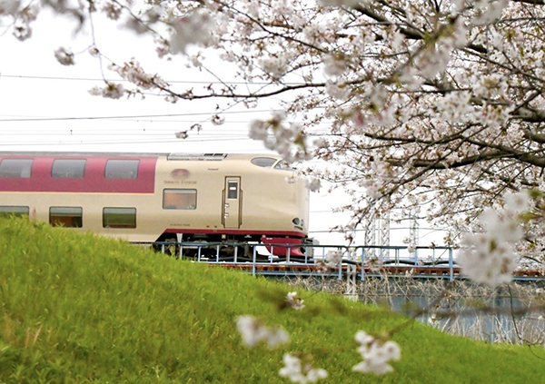 雨の雫が残る桜を霞め行くサンライズエクスプレス。