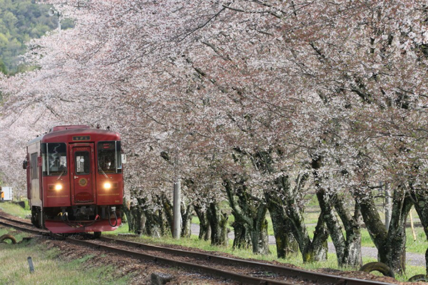 散り始めた桜並木の横を列車が通過します