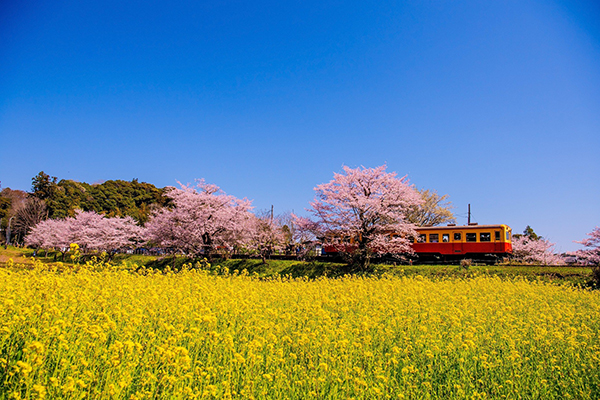 桜に菜の花、青い空。春爛漫の中、気動車が花を添えます。