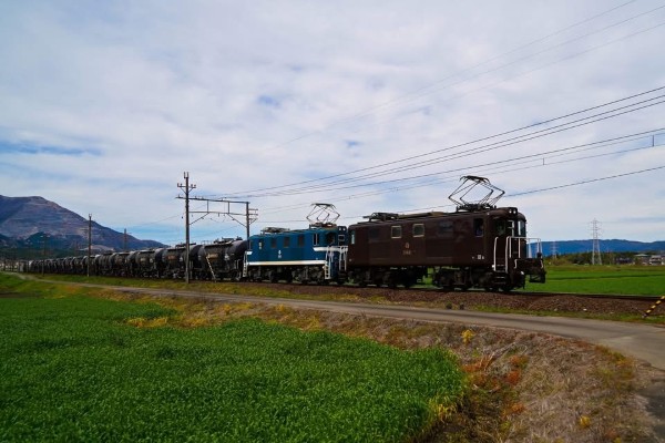 藤原岳と富田駅に向かう、特別塗装ED45牽引のセメント貨物。