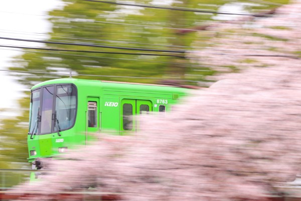 桜の海をダイブするかのように緑の京王が飛び出してきました。