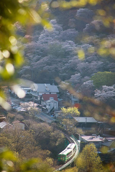 桜咲き誇る矢祭山をバックに「風っこ」が走る。