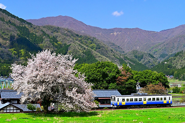えちぜん鉄道を見守る一本桜。里山にも春が来ました。