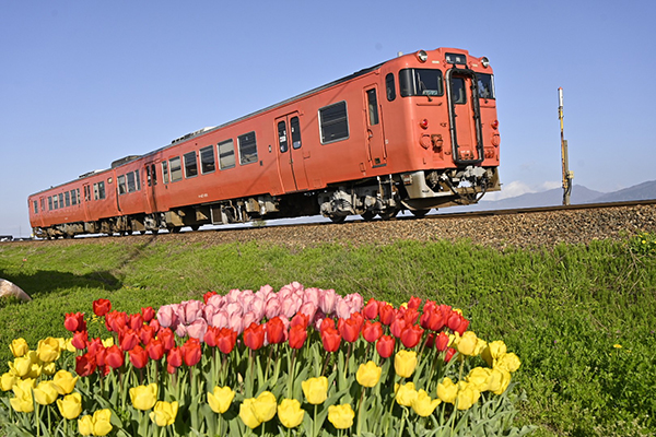 色彩豊かなチューリップを横目に、赤い気動車が行きます。