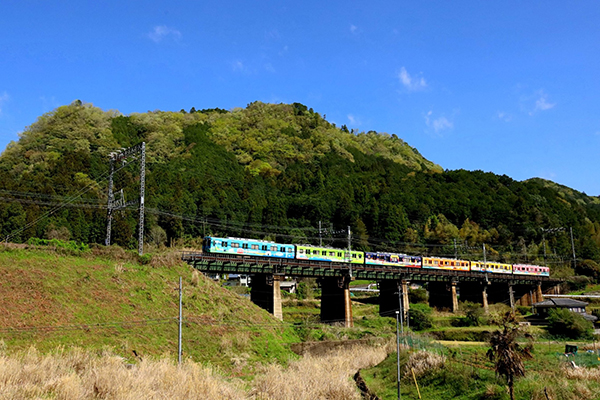青空が綺麗な今朝、三本松鉄橋を渡るラッピング電車の一枚です。