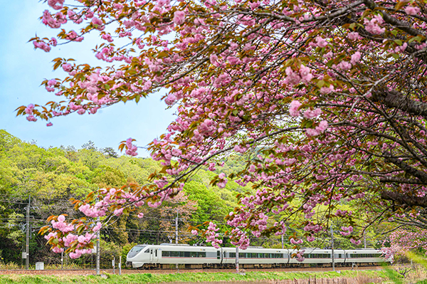 武庫川堤ではソメイヨシノから八重桜へと移り変わり、新緑をバックに「こうのとり」が駆け抜ける。
