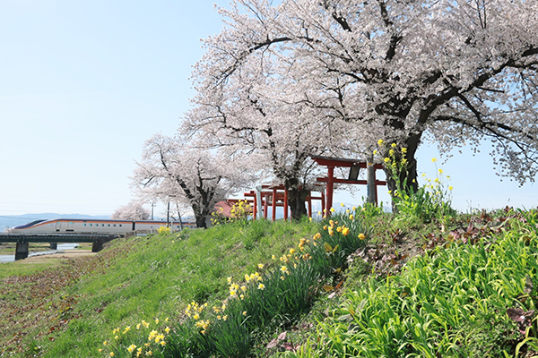 春を感じる桜、菜の花、水仙が咲き、赤い鳥居と神社、鉄橋を渡る新幹線。