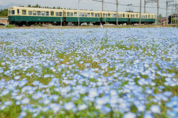 一面に広がるネモフィラの絨毯の向こうを200系が駆け抜けていきました。