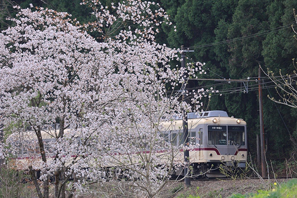 立山駅から下山してきた雷鳥カラー車に、満開の桜が労をねぎらっていました…。