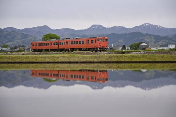 残雪山々を背に赤い気動車と共に、水面に写し出されます。