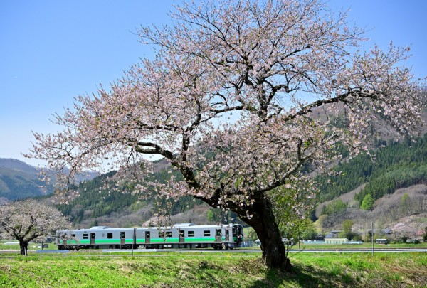 青空の下、綾織の桜がHB-E220系列車を歓迎していました。