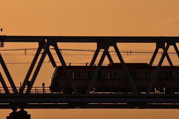 5000系のスラントなノーズを、夕陽が優しく照らします。