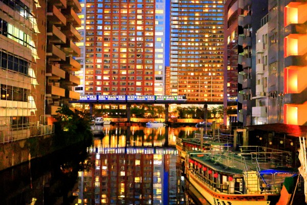 高層マンションが立ち並ぶ運河沿いは東京モノレールが走る大切なルート、宵の時間は大東京絶景夜景へと変貌する。