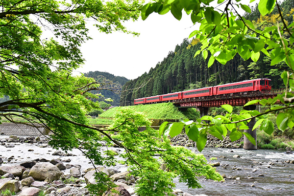この日は久しぶりに晴れの天気予報。早速、久大本線沿線の新緑景色を撮りたいと玖珠川に架かる橋梁沿いへ出かけました。玖珠川沿いの川岸に枝垂れるイロハモミジの若葉や柿の若葉が、程よく列車の収まる若緑の額縁になってくれました。