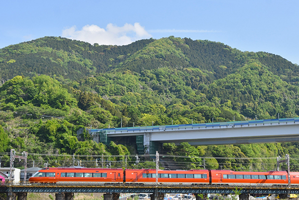 新緑の松田山をバックに鮮やかなオレンジ色の小田急ロマンスカーGSEが駆け抜けて行きました。