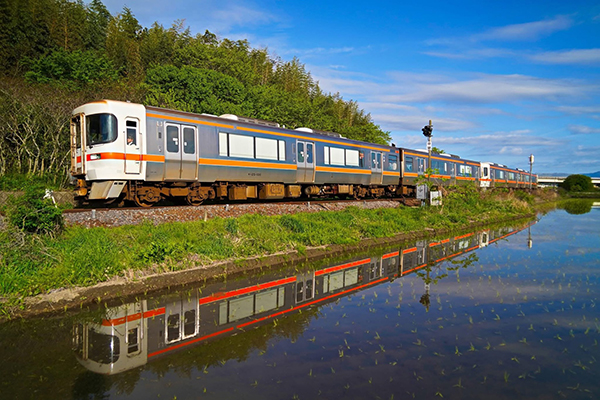 早朝の田園地帯を駆け抜ける、伊勢市駅に向かう「キハ25形」4両編成。