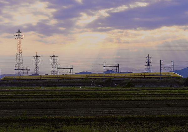 曇天の中かもの切れ目から夕陽が差し込む中、目的地に向かうドクターイエロー。
