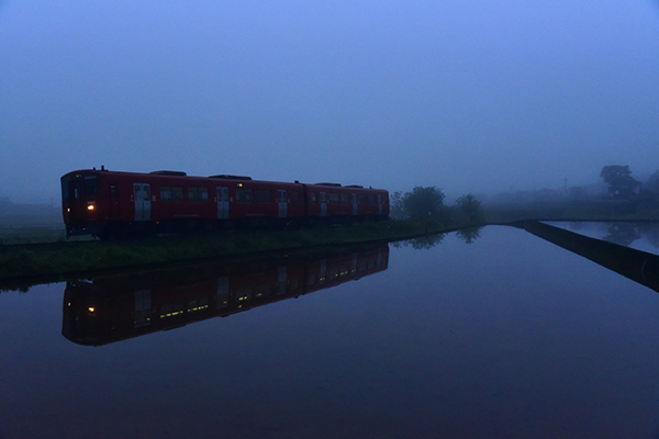 田んぼに水が入り列車と昇り始めた朝日、そして背景に佇む由布岳を入れて水鏡の一枚を撮りたいとこの地を訪れましたが、この時期には珍しく朝霧が立ち込め、当初の狙いどうりにはいきませんでした。ですがブルーモーメントの世界に始発列車の明りが水鏡に映しだされる幻想的な一枚になりました。 2026.04.27 撮影 渡邉邦治